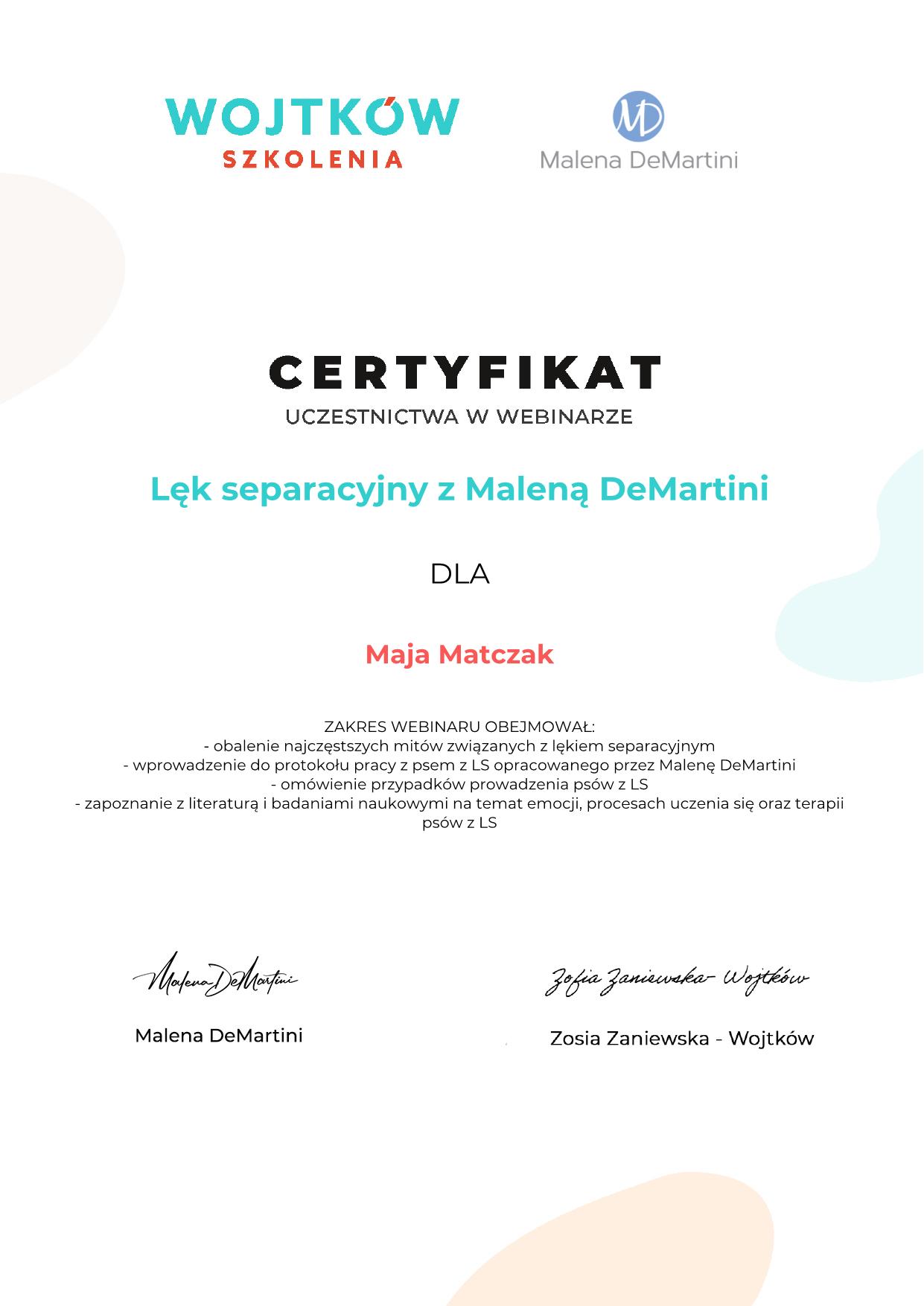Absolwentka psychologii na UAM oraz studiów podyplomowych na Uniwersytecie SWPS na kierunku Psychologia zwierząt. Od 2014 roku prowadzi własną praktykę behawioralną. Posiada kompetencje w zakresie oceny zachowania zwierząt, diagnozowania i rozwiązywania problemów behawioralnych u psów i kotów. Pracuje wyłącznie metodami pozytywnych wzmocnień. W swojej praktyce kieruje się szacunkiem dla potrzeb zwierząt wynikającymi z ich natury, okresu rozwojowego, doświadczeń życiowych oraz stanu emocjonalnego. Bardzo skupia się również na komunikacji zwierząt. Doświadczenie w pracy ze zwierzętami zdobywała m.in. w klinikach weterynaryjnych w Poznaniu; przy hipoterapii oraz we współpracy z domem tymczasowym Fundacji dla zwierząt Animalia. Nieustannie podnosi swoje kwalifikacje uczestnicząc w seminariach, warsztatach oraz konferencjach.